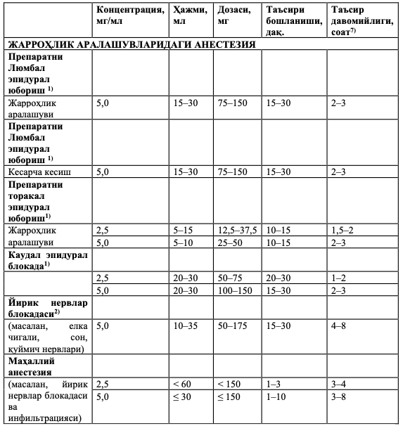 Қуйидаги жадвалда ўрта ёшдаги катта беморларда блокада ўтказишда энг кўп қўлланиладиган усуллар учун препаратни дозалаш бўйича йўл йўриқлар келитирилган.