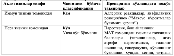 Ножўя таъсирлар рўйхати тўлдирилган жадвалда келтирилган.