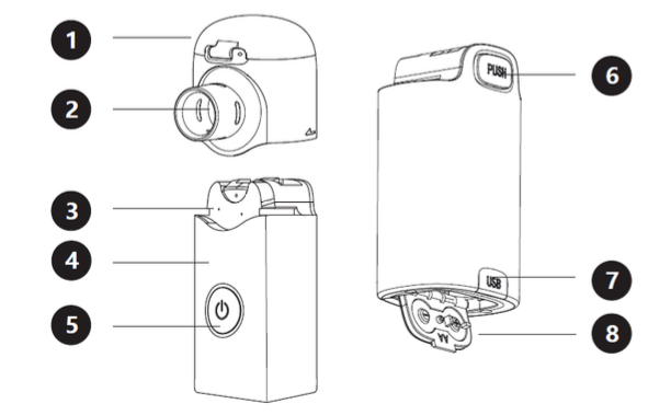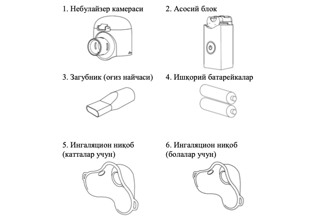 Қуйида келтирилган таркибий қисмлар қутида бўлиши керак. Агар бирор бир таркибий қисмлар етишмаса, сотиб олинган дўконга ёки «Юрия-фарм» МЧЖ, Украина ваколатхонаси вакилига мурожаат этинг. Бутловчилари (оғиз найчаси, ингаляция ниқоби, небулайзер камераси)ни алоҳида сотиб олиш мумкин