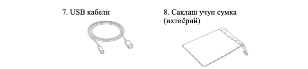 Эътибор қилинг, USB кабелида 5 V (В) чиқиш кучланиши учун мўлжалланган Micro-USB улагичи мавжуд.