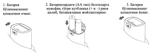 • Қутблик (+ ва –) бузилиши бўлган батареяларни ўрнатиш тақиқланади.