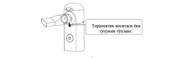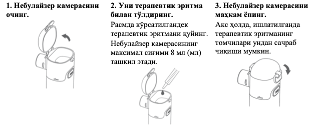 Терапевтик эритма тўғридан-тўғри йиғилган мосламага ёки небулайзер камерасига алоҳида қуйилиши мумкин. Небулайзер камерасига терапевтик эритмани алоҳида қуйиш учун уни асосий блокдан чиқариб олинг ва ичига терапевтик эритмани қуйинг. Шундан сўнг, небулайзер камерасини маҳкам ёпинг ва уни асосий блокка ўрнатинг.