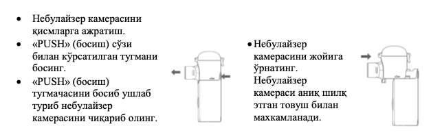 • Асосий блок ва небулайзер камерасини тушиб кетишига йўл қўйманг ва кучли таъсирларга дучор қилманг. Улар шикастланиши, қўллаш учун яроқсиз ҳолга келиши ва фойдаланувчини электр токи уриши мумкин.