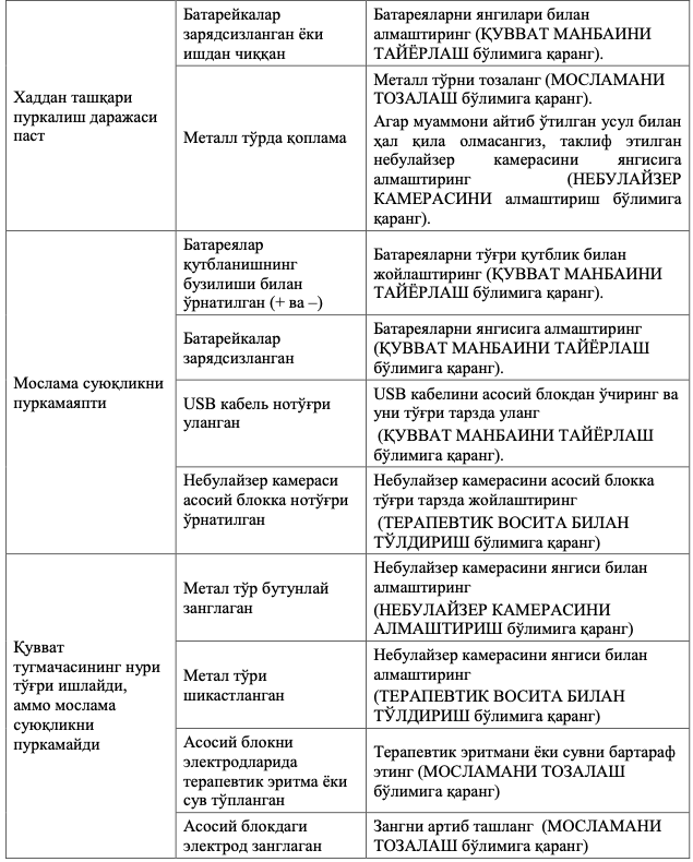 Фойдаланиш ва техник хизмат кўрсатиш қоидалари бузилган, шунингдек небулайзердан нотўғри фойдаланилган тақдирда кафолат бекор қилинади.