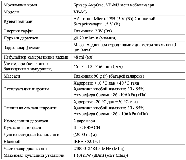 Бризер АйрОкс, VP-M3 меш небулайзер, индивидуал фойдаланиш учун мўлжалланган.