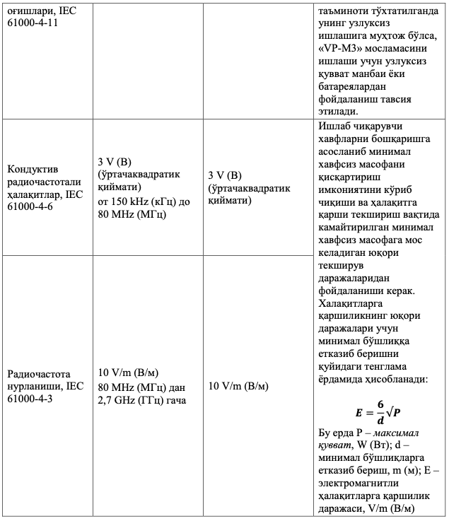МАСАЛАН: электр тиббиёт ускуналари учун IEC 60601-1-2:2014 стандартининг 6-жадвалида кўрсатилганидек, максимал чиқиш қуввати 2 W (Вт) бўлган одатий мобил телефон қаршилиги d = 3,3 m (м) ни 3 V/m (В/м) даражасини беради.