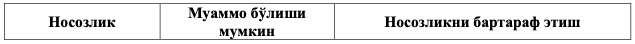 Агар мосламадан фойдаланиш жараёнида бирор бир носозлик юзага келса, аввал қуйидагиларни текширинг.