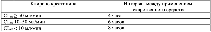 Пациентам с почечной недостаточностью минимальный интервал между каждым приемом лекарственного средства должен быть установлен согласно таблицы ниже: