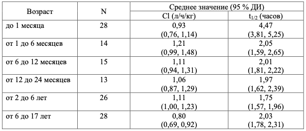 Данные по применению детям – от новорожденных (родившихся в срок от 28 до 44 недель гестации) до 17 лет ограничены. Период полувыведения дексмедетомидина у детей (от 1 месяца до 17 лет), вероятно, приравнивается к взрослым, но у новорожденных детей (до 1 месяца) он кажется выше. В возрастных группах от 1 месяца до 6 лет скорректированный по массе тела клиренс кажется выше, но снижается в старшем возрасте. Вследствие незрелости у новорожденных детей (в возрасте до 1 месяца) скорректированный по массе тела клиренс может быть ниже (0,9 л/ч/кг), чем в старших возрастных группах.