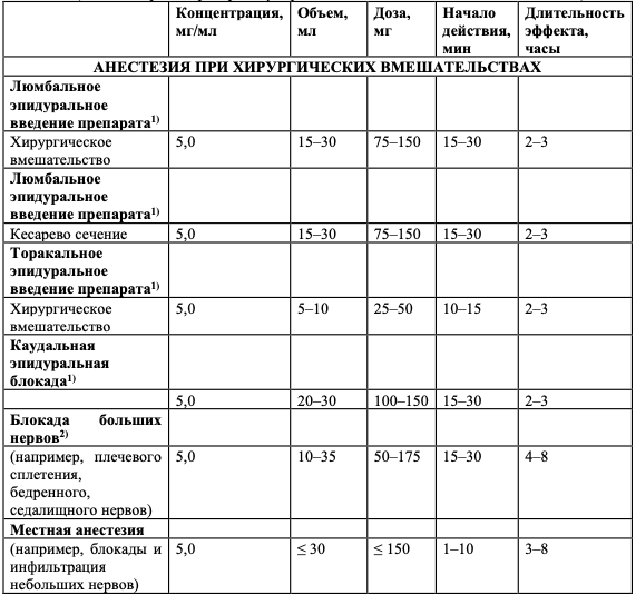 Следующая таблица представляет собой руководство по дозировке препарата у взрослых пациентов среднего возраста при применении наиболее часто применяемых методик проведения блокады. Цифры отражают ожидаемый диапазон средних допустимых доз препарата. Стандартные учебные пособия должны быть учтены в случае наличия факторов, влияющих на отдельно взятые методики проведения блокады, и для обеспечения индивидуальных требований пациентов.