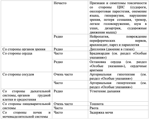 В случае, когда избыточное количество препарата достигает системного кровотока, могут появиться симптомы и признаки токсичности, которые выходят из центральной нервной и сердечно-сосудистой систем. Признаки развития токсического воздействия на центральную нервную систему (см. раздел. «Побочные действия»), как правило, предшествуют сердечно- сосудистым эффектам, поскольку признаки токсического воздействия на центральную нервную систему наблюдаются при более низких концентрациях препарата в плазме крови.
