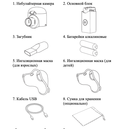 Перечисленные ниже составные части должны содержаться в коробке. Если каких-то составных частей не хватает, обратитесь в магазин, в котором Вы приобрели изделие, или к уполномоченному представителю в Украине, ООО «Юрия фарм». Комплектующие (загубник, ингаляционная маска, небулайзерная камера) можно приобрести отдельно.
