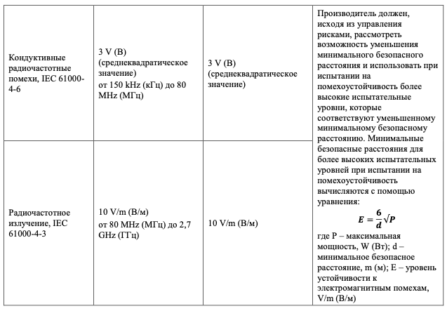НАПРИМЕР: как указано в таблице 6 стандарта IEC 60601-1-2:2014 для медицинского электрооборудования, обычный сотовый телефон с максимальной выходной мощностью 2 W (Вт) при уровне помехоустойчивости 3 V/m (В/м) дает d = 3,3 m (м).